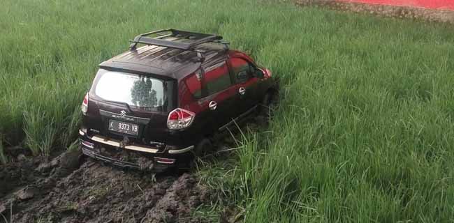 Satu unit mobil terperosok ke sawah saat hujan di Jalan Lingkar Selatan, Kudus, Jawa Tengah, dekat SPBU Tanjung Karang, Selasa kemarin (27/6). Kepala Data dan Informasi Badan Nasional Penanggulangan Bencana (BNPB) Sutopo Purwo Nugroho lewat akun @Sutopo_BNPB menjelaskan, petugas sudah melakukan evakuasi terhadap mobil Suzuki Ertiga tersebut. Repro