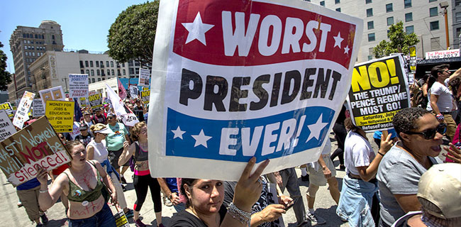 Sejumlah orang turun ke jalan menyuarakan penentangan mereka terhadap kebijakan Presiden Amerika Serikat Donald Trump akhir pekan kemarin (2/7). Mereka menuntut pemakzulan atas kepemimpinan Trump karena dinilai telah menyakiti konstitusi. Salah seorang partisipan membawa spanduk bertuliskan "Presiden terburuk yang pernah ada". AFP