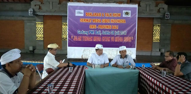 Ketua Serikat Media Siber Indonesia (SMSI) Bali Immanuel Dewata Oja (kiri) bersama Ketua Perdatuan Wartawan Indonesia (PWI) Bali Dwikora Putra dalam jumpa pers peluncuran SMSI di Provinsi Bali, Sabtu (8/7). SMSI telah memiliki kepengurusan di 22 provinsi, dan di bulan September mendatang akan mendaftarkan diri menjadi konstituen Dewan Pers. SMSI Bali