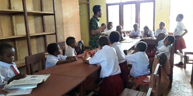 Seorang prajurit TNI menjadi guru untuk memberikan pelajaran kepada murid SD Negeri pesiapan Kampung Aroa di Kabupaten Boven Digoel, Papua, Selasa (25/7). Personil TNI tersebut berasal dari Satuan Tugas TNI Manunggal Membangun Desa ke 99 Wilayah Kodim 1711/BVD. Repro