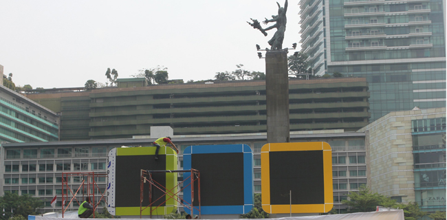 Pekerja memasang layar digital hitung mundur (countdown) pelaksanaan Asian Games 2018, di Bundaran HI Jakarta, Sabtu (12/8). Layar hitung mundur (countdown) untuk pelaksanaan Asian Games 2018 di Jakarta dan Palembang, akan mulai dinyalakan pada 18 Agustus 2017 mendatang untuk menggaungkan perhelatan olah terbesar se Asia tersebut. Tedy Kroen/RM