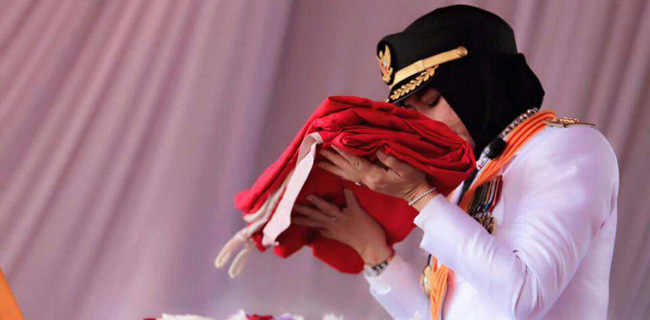 Bupati Kutai Kartanegara Rita Widyasari mencium bendera merah putih dengan penuh hikmat sebelum menyerahkannya kepada Pasukan Pengibar Bendera dalam Upacara Peringatan Detik-Detik Proklamasi ke 72 Kemerdekaan Indonesia yang berlangsung di Tenggarong, Kamis, (17/8). Dar Edi Yoga/RMOL.