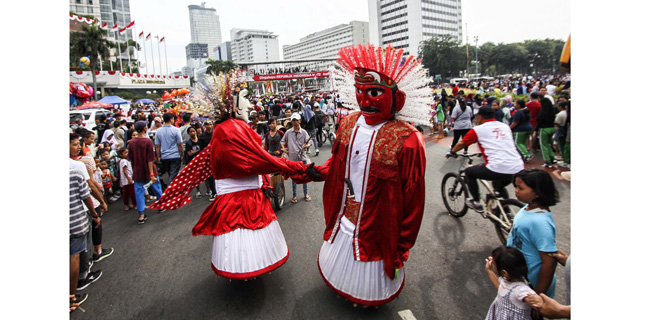 Kesenian ondel-ondel berkostum merah putih menghibur ribuan warga saat car free day di kawasan Bundaran Hotel Indonesia, Jakarta Pusat, Minggu (20/8). Budaya ondel-ondel khas betawi terus dilesatarikan di jalan untuk kegiatan masyarakat dan menjadi lapangan pekerjaan. Dwi Pambudo/RM