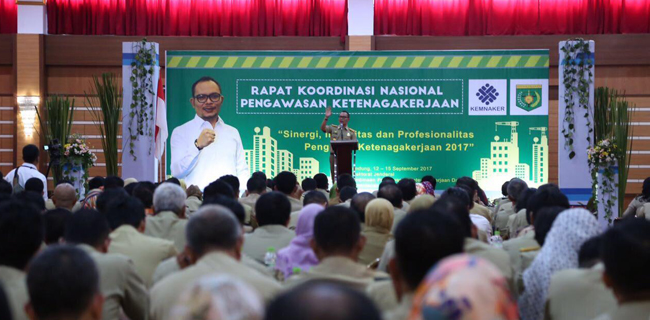 Online sekaligus memberikan pengarahan Rapat Koordinasi Nasional Pengawasan Ketenagakerjaan 2017 di Hotel Grand Asrilia Bandung, Rabu (13/9).