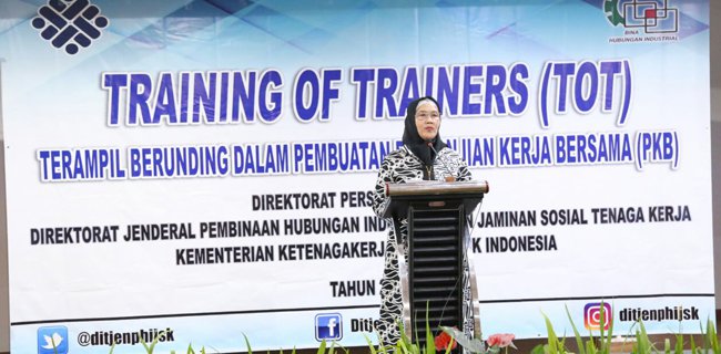 Pernyataan tersebut disampaikan oleh Direktur Jenderal Pembinaan Hubungan Industrial (PHI) dan Jaminan Sosial Tenaga Kerja (Jamsostek) Kemnaker Haiyani Rumondang saat memberikan sambutan pada acara Training of Trainers (TOT) "Terampil Berunding dalam pembuatan Perjanjian Kerja Bersama (PKB)" di Hotel Royal Bogor, Jawa Barat, Minggu (12/11) lalu