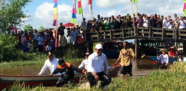 Menteri Amran yang menaiki kapal toktok atau kapal tradisional nampak tidak sabar membabat padi. Ia kemudian loncat dari atas perahu yang dinaikinya. Sontak celana dan bajunya basah lantaran air rawa merendam badan Amran hingga setinggi dada.