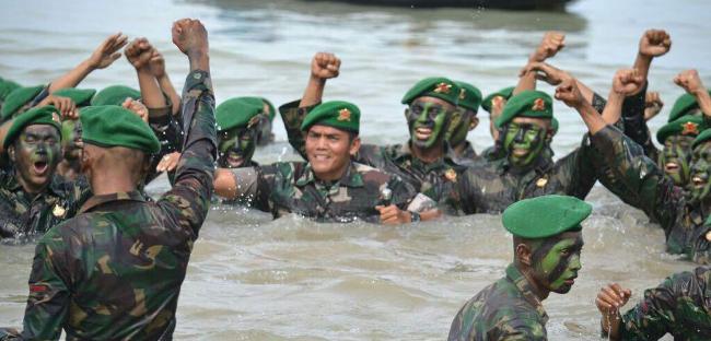 Sebanyak 138 mantan siswa Pendidikan Kejuruan Tamtama Infanteri TA 2017 mengikuti latihan Yudha Wastu Pramuka, di Pantai Pak Lotay Singkawang, Kalimantan Barat, Senin (4/12). Danrindam XII/Tanjungpura Kolonel Infanteri Khairul Anwar Mandailing mengatakan latihan Yudha Wastu Pramuka dan tradisi pembaretan, merupakan bagian yang sangat penting dan tidak terpisahkan dari perjalanan hidup prajurit infanteri.