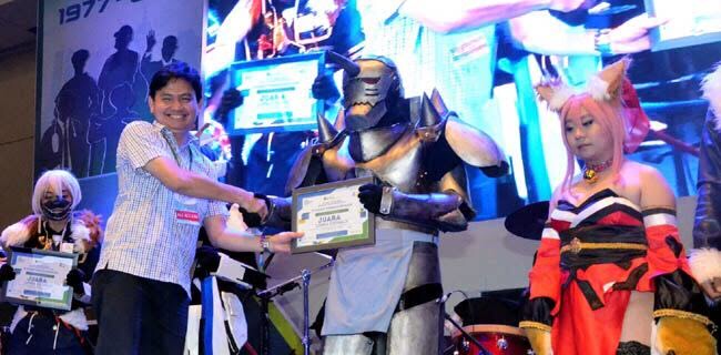 Deputi direktur bidang Humas dan antar lembaga Bpjs Ketenagakerjaan Irvansyah Utoh Banja saat menyerahkan hadiah kepada pemenang festival cosplay dalam rangka kegiatan 40 jam bersama bpjs ketenagakerjaan di Ice BSD, Tangerang, Sabtu (16/12). Dalam acara malam ini juga dimeriahkan oleh grup band slank dan sheila on 7. Indra Hardi/RM