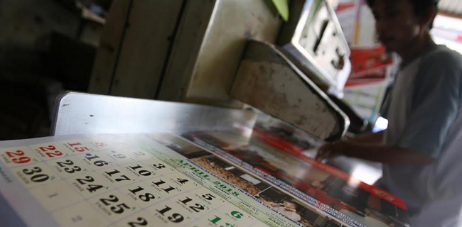 Pekerja membuat kalender 2018 di salah satu percetakan di Jalan Bungur, Kawasan Pasar Senen, Jakarta. Jelang pergantian tahun baru 2018 sejumlah percetakan mengalami peningkatan permintaan pembuatan kalender dengan berbagai ukuran dan gambar. Mayoritas permintaan kalender baru dari berbagai instansi pemerintah, perusahaan, hotel hingga sekolah. Putu Wahyu Rama/RM