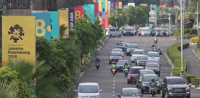 Kendaraan melintas di sisi Tiang-tiang Proyek Monorel ditempeli Baliho Asian Games, di sepanjaang ruas Jalan Asia Afrika hingga Jalan Gelora, Kawasan Senayan, Jakarta, Senin (25/12). Pemprov DKI Jakarta meminta PT Adhi Karya untuk merobohkan seluruh tiang monorel miliknya termasuk di ruas Rasuna Said, selain hanya menjadi papan iklan, tiang-tiang tersebut sudah tidak ada gunanya lagi dan cenderung mengganggu keindahan kota. Tedy Kroen/Rakyat Merdeka