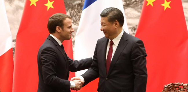 Presiden Perancis Emmanuel Macron (kiri) berjabat tangan dengan Presiden China Xi Jinping dalam konferensi Pers di Beijing (Selasa, 9/1). Kunjungan resmi Macron ke China adlaah untuk membawa misi kerjasama ekonomi, termasuk perjanjian kerjasama soal penjualan Airbus. Reuters