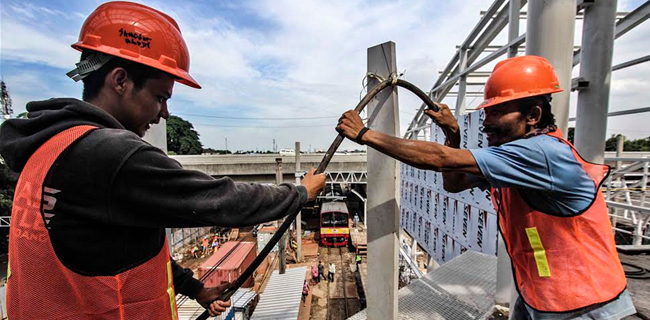 Pekerja membangun stasiun KRL Jabodetabek untuk mengoperasikan jalur kereta api dwi ganda atau Double Double Track (DDT), di Stasiun Cakung Jakarta pekan ini. Targetnya stasiun Cakung dan 4 stasiun lainnya siap mengoperasikan jalur ganda, selambat-lambatnya Oktober 2018. Dwi Pambudo/RM