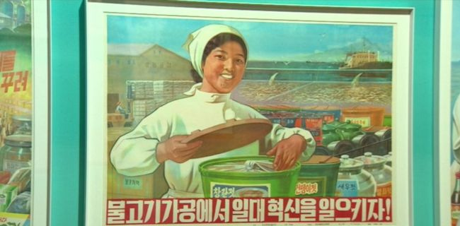 Gambar ini merupakan poster cetak yang dipamerkan dalam pameran desain grafis dari Korea Utara yang digelar di London Inggris pekan ini. Judul dari poster ini adalah "Mari berinovasi industri perikanan!". Memancing sendiri adalah salah satu industri besar di Korea Utara, namun di bawah sanksi internasional tidak dapat menjual makanan lautnya ke luar negeri. Dalam pameran ini dipamerkan poster-poster atau jenis desain grafis lainnya yang diperoleh dari Korea Utara. BBC