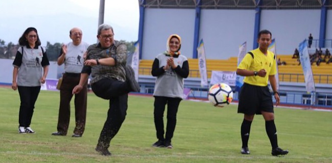Disaksikan Gubernur Aher dan Kadisnakertrans Jabar Ferry Sofwan, Dirjen Pembinaan Hubungan Industrial dan Jaminan Sosial (PHI dan Jamsos) Kemnaker Haiyani Rumondang menyerahkan cendera mata berupa bola dari Menaker Hanif Dhakiri sebagai simbolis dibukanya kompetisi Lipesia Zona Jabar.