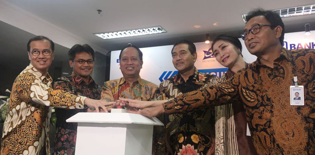 Menteri Riset, Teknologi, dan Pendidikan Tinggi RI Mohamad Nasir (ketiga kiri) bersama Direktur Utama Bank BRI suprajarto (ketiga kanan), Direktur Konsumer Bank BRI Handayani (kedua kanan), Direktur Hubungan Kelembagaan Bank BRI Sis Apik Wijayanto (kanan), Direktur Digital Banking dan Teknologi Informasi Bank BRI Indra Utoyo (kiri), dan Sekjen Kemenristek Dikti Ainun Na'im (kedua kiri) melakukan prosesi penekanan tombol pada launching produk student loan "BRIGUNA Flexi Pendidikan" di Gedung Kementerian Riset, Teknologi dan Pendidikan Tinggi, Jakarta, Rabu (21/3). Kegiatan ini merupakan langkah nyata Bank BRI untuk menindaklanjuti instruksi Presiden RI Joko Widodo yang meminta perbankan untuk mengeluarkan kredit pendidikan atau student loan. Humas BRI