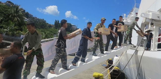 Berbagai jenis makanan, pakaian dan obat-obatan dari Pemerintah Daerah Maluku diangkut masuk ke KN Tanjung Datu-1101 milik Bakamla RI, yang bersandar di Dermaga Perikanan Nusantara Ambon, Maluku, Rabu (28/3).