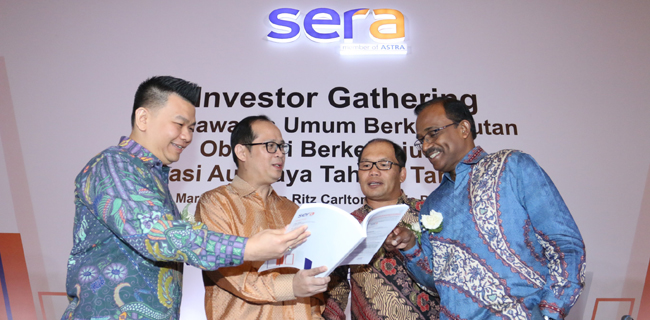 Presiden Direktur PT Serasi Autoraya (SERA) Firman Yosafat Siregar (kedua dari kiri) berbincang dengan jajaran direksi (dari kiri) Direktur Hadi Winarto, Edi Gunawan, dan Kumaraguru Nadaysen usai Penawaran Umum Berkelanjutan Obligasi Berkelanjutan I Serasi Autoraya Tahap I Tahun 2018, di Jakarta, baru-baru ini.