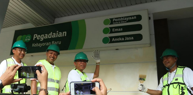 Komisaris Pegadaian Heru Subiantoro (tengah) bersama Direktur Utama Pegadaian Sunarso (kanan), Direktur Produk Pegadaian Harianto widodo (kedua kiri) dan Direktur Operasional dan Pemasaran Damar Latri Setiawan