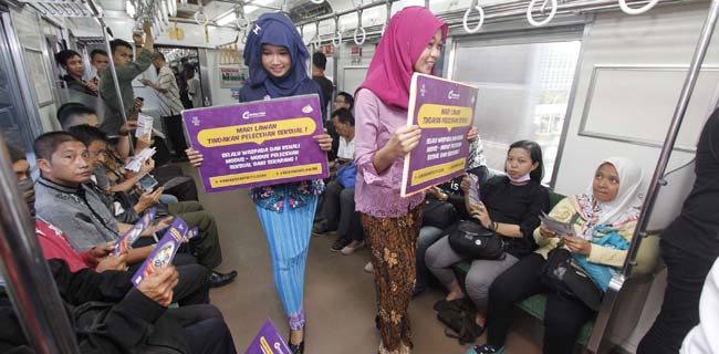 Petugas Kereta Commuter Indonesia (KCI) berpakaian kebaya bersama komunitas pengguna Kereta Rel Listrik (KRL) dan komunitas perempuan melakukan kampanye dan sosialisasi "Mencegah Pelecehan Seksual di Transportasi Publik" dengan membagikan brosur dan kipas kepada penumpang dalam rangka memperingati Hari Kartini di dalam kereta dan Stasiun Juanda, Jakarta, Jumat (20/4).