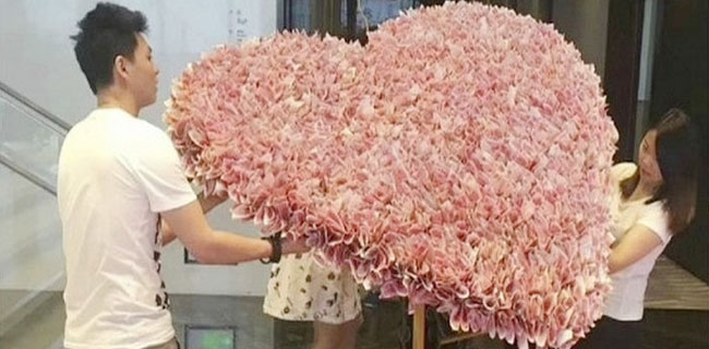 Bukan buket biasa, meÂlainkan yang terbuat dari 3.344 uang kertas 100 Yuan atau Rp 706 juta yang dirangkai sedemikian rupa.
