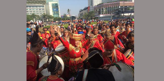Alunan bunyi tambua yang menghentak menyedot perhatian warga saat car free day di Bundaran Hotel Indonesia, Jakarta Pusat, Minggu (8/7). Warga pun dibuat ikut bergoyang diiringi suara gendang tambua. Pertunjukkan kesenian khas Sumatera Barat ini diadakan untuk memeriahkan Festival Danau Maninjau. Swara Setia/RMOL