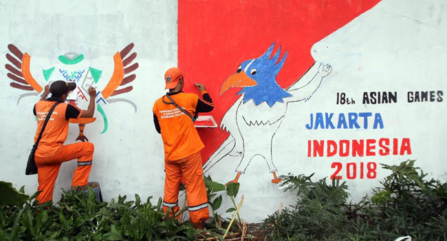 Setiap keluraan di DKI Jakarta mempercantik wilayah masing-masing, diantaranya dengan memasang bendera negera peserta dan menggambar mural pada tembok-tembok, untuk mendukung kemeriahan pelaksanaan Asian Games di Jakarta dan Palembang, pada pertengahan Agustus 2018 mendatang. Tedy Kroen/Rakyat Merdeka