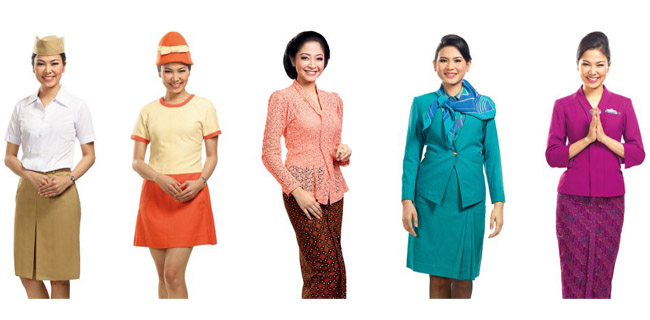 Rupanya tiap dasawarsa ganti mode. Lihatlah pramugari tahun 1980-an. Era dandanan Bu Tien. Diciptakan dua model: rok dan kebaya. Cukup mengesankan. Saya nilai tujuh.