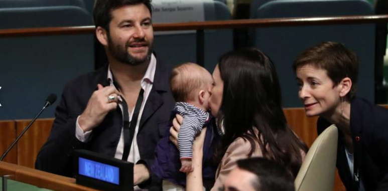 Perdana Menteri Selandia Baru Jacinda Ardern mencium bayinya, Neve, sebelum berbicara di Nelson Mandela Peace Summityang merupakan bagian dari sidang umum PBB ke-73 di New York, Amerika Serikat pekan ini. Reuters