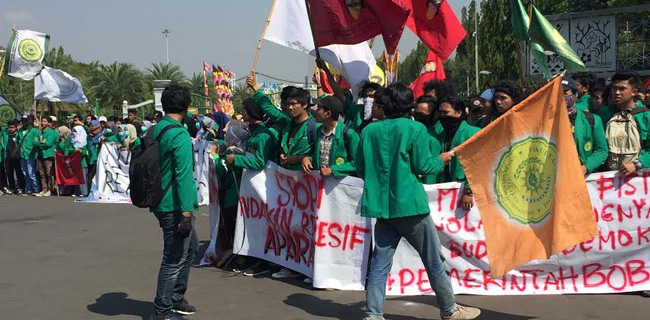 Ratusan mahasiswa dari Aliansi Mahasiswa Universitas Muhammadiyah Jakarta menggelar aksi damai di depan Istana Negara, Jalan Merdeka Barat, Jakarta Pusat, Selasa (25/9). Dalam tuntutanya, mereka mengutuk tindakan refresif aparat Kepolisian dan meminta agar pemerintah menghentikan impor beras. Idham Anhari/RMOL