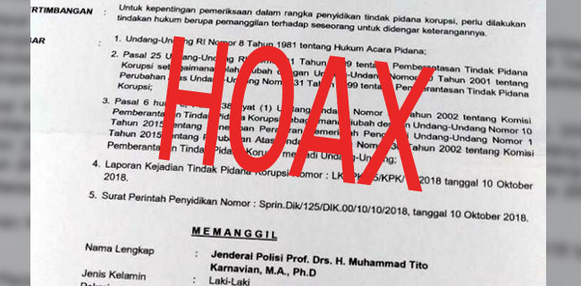 Sebelumnya beredar surat panggilan tersangka kepada Tito Karnavian oleh KPK yang ternyata hoax. KPK sudah memastikan bahwa surat panggilan kepada Tito untuk diperiksa sebagai tersangka tindak pidana korupsi itu adalah hoax alias palsu. Baik KPK maupun Polri kini tengah mencari pembuat dan penyebar surat panggilan palsu tersebut.