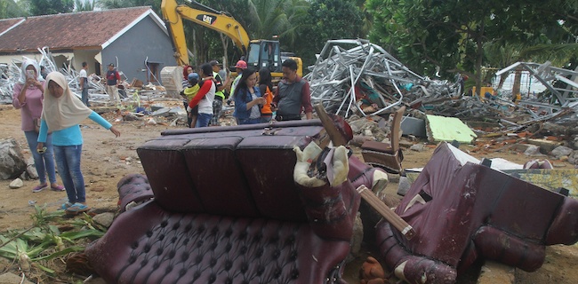 Petugas dari Basarnas, Badan Nasional Penanggulangan Bencana (BNPB), dan relawan dibantu dengan warga setempat melakukan evakuasi di Resort Vila Stephanie, Pantai Carita, Banten, Senin (24/12). Putu Wahyu Rama/RM