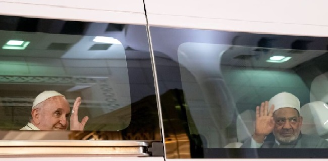 Pemimpin Gereja Katolik Roma Paus Fransiskus duduk bersama dengan Imam Masjid Al Azhar Mesir Ahmed Mohamed el-Tayeb saat tiba di bandara internasional Abu Dhabi Uni Emirates Arab (UEA) (Minggu, 3/2). Kunjungan Paus Fransiskus ke UEA adalah kunjungan bersejarah, karena untuk pertama kalinya Paus berkunjung ke negara teluk. Reuters