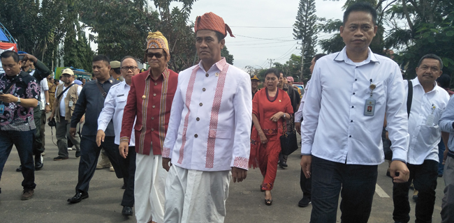Menteri Amran disambut Bupati Tana Toraja Nicodemus Biringkanae. Menuju Kolam Kota Makale, mereka kompak mengenakan baju Pa'tannun, yaitu pakaian adat asal Tana Toraja.