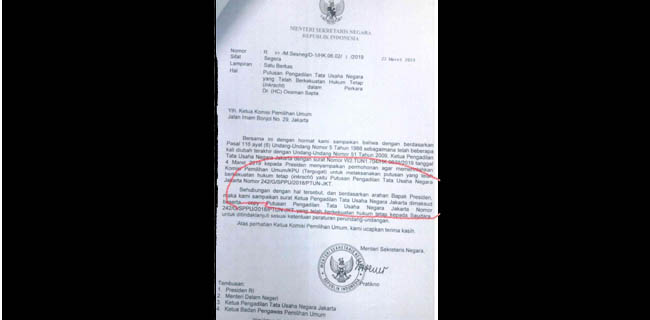 “Sehubungan dengan hal tersebut, dan berdasarkan arahan Bapak Presiden, maka kami sampaikan surat Ketua Pengadilan Tata Usaha Negara dimaksud beserta copy Putusan Pengadilan Tata Usaha Negara Jakarta Nomor 242/G/SPPU/2018/PTUN-JKT. yang telah berkekuatan hukum tetap kepada Saudara untuk ditindaklanjuti sesuai peraturan perundangan-undangan,†tulis surat Mensesneg tersebut.