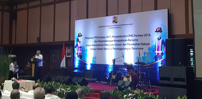 Hal ini disampaikannnya dalam pelepasan PNS Formal 2017, penyambutan CPNS formasi 2018 dan penandatanganan Kesepakatan Bersama antara Kementerian Pekerjaan Umum dan Perumahan Rakyat dengan Badan Nasional Penanggulangan Terorisme (BNPT) yang diikuti oleh 1027 CPNS.