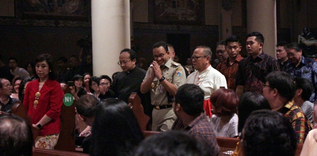 Suasana hangat menyelimuti misa Natal yang digelar di Gereja Katedral, Jakarta Pusat, Selasa (24/12). Terlebih dengan kehadiran Gubernur DKI Jakarta, Anies Baswedan, jemaat gereja tampak antusias dengan kedatangan orang nomor satu di DKI Jakarta itu. Kedatangannya ke Katedral merupakan rangkaian kunjungan Pemprov DKI di tujuh gereja, yakni Gereja Katolik Santo Kristoforus di Kecamatan Grogol Petamburan, Jakarta Barat; Gereja Huria Kristen Batak Protestan (HKBP) Petojo, Grogol; Gereja Katolik Keluarga Kudus, Rawamangun; Gereja Huria Kristen Batak Protestan (HKBP), Rawamangun; Gereja Protestan Indonesia bagian Barat (GPIB), Gereja Protestan Indonesia bagian barat (GPIB) Paulus Jakarta, dan Gereja Katedral Jakarta. 04PAN/RMOL