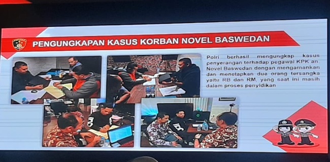 "Kemarin kasus penyerangan terhadap pegawai KPK atas nama Novel Baswedan dengan mengamankan dan menetapkan dua orang tersangka berinisial RM dan RB," kata Idham saat paparan rilis.