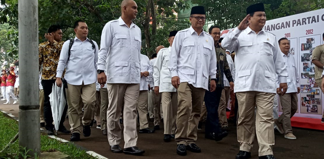Ketua Umum DPP Partai Gerindra Prabowo Subianto menghadiri peringatan Hari Ulang Tahun (HUT) ke-12 Partai Gerindra, di Aula DPP Partai Gerindra, Jalan Harsono RM No. 54, Ragunan, Pasar Minggu, Jakarta Selatan, Kamis (6/2). Prabowo hadir bersama petinggi partai diantaranya Rachmawati Soekarnoputri, Sandiaga S. Uno, Edhy Prabowo, Fadli Zon, Sufmi Dasco Ahmad, dan Sekjen Ahmad Muzani. Terlihat juga Gubernur DKI Jakarta Anies Baswedan. Ahmad Alfian/RMOL