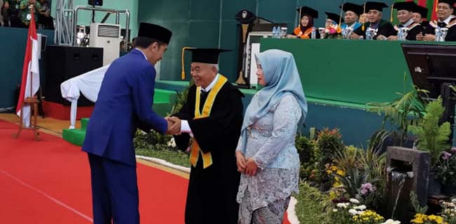 Presiden Joko Widodo hadir di acara pengukuhan Sabtu lalu. Saat menuju panggung Presiden Jokowi menghadap ke senat guru besar dulu. Lalu membungkuk khusu' memberi hormat. Demikian pula setelah turun dari podium. Kembali menghadap senat dan kembali membungkuk hormat.