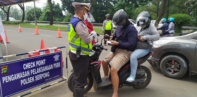 check point wilayah hukum Tangsel, dalam hari pertama pelaksanaan PSBB setidaknya melakukan teguran kepada ratusan pengendara yang melanggar.