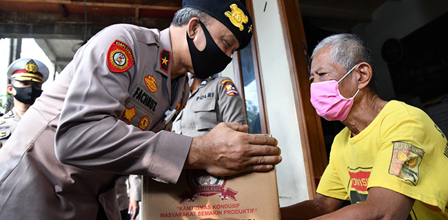 Kakorsabhara Baharkam Polri Irjen Pol Wahyudi Hidayat menyerahkan satu per satu bantuan paket sembako kepada pengrajin tempe.