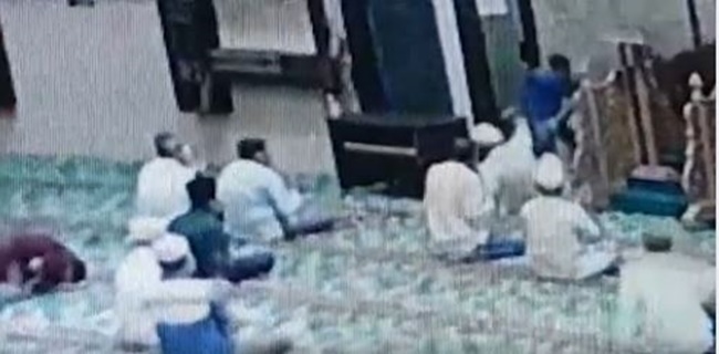 Dari rekaman CCTV yang beredar, tampak imam dan jamaah yang usai menunaikan ibadah shalat dikejutkan dengan kedatangan dua orang mencoba menusuk imam yang datang dari arah belakang mimbar.