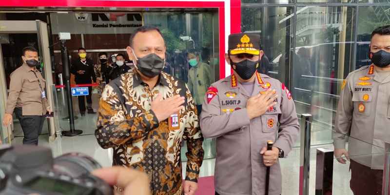 Setelah menyapa wartawan, Kapolri beserta jajarannya langsung masuk ke Gedung Merah Putih dan disambut Ketua KPK, Komjen Firli Bahuri.