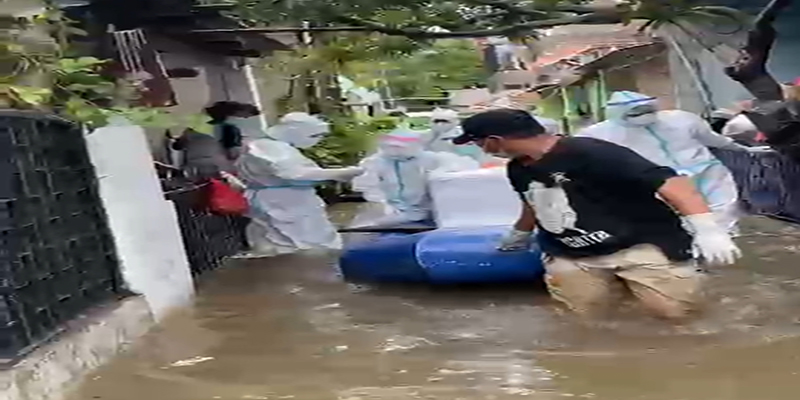 Banjir yang menggenang di wilayah Jakarta tersebut tidak menghentikan kerja Tim Pemulasaran Jenazah Covid-19 Dit Samapta Polda Metro Jaya.