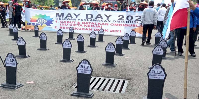 Saat menggelar aksinya, massa buruh membuat batu nisan yang dijejerkan di halaman Monas.