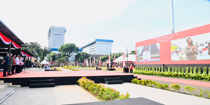 Didampingi Kapolri Jenderal Listyo Sigit Prabowo, Panglima TNI Marsekal Hadi Tjahjanto, Menteri Kesehatan Budi Gunadi Sadikin dan Kepala BNPB Letjen Ganip Warsito, Presiden Jokowi melihat langsung tahap demi tahap proses vaksinasi yang digelar menyabut HUT Bhayangkara ke-75 itu.