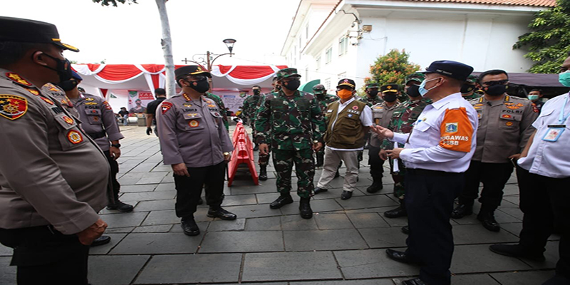 Panglima TNI Marsekal Hadi Tjahjanto dan Kapolri Jenderal Listyo Sigit Prabowo meninjau vaksinasi massal di Kota Tua, Jakarta Barat. Kegiatan vaksinasi massal ini diselenggarakan Polsek Metro Tamansari dan Koramil 01 Tamansari sejak tanggal 5 hingga 9 Juli.