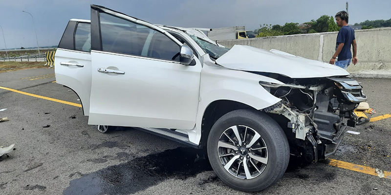 Mobil Pajero Sport putih itu turut ditumpangi oleh suami Vanessa, Febri Andriansyah, tampak ringsek pada bagian depannya usai mengalami kecelakaan tunggal.