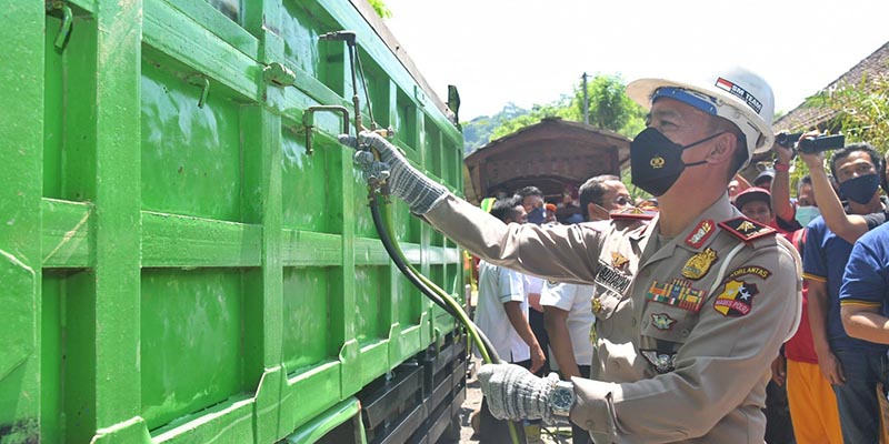 Direktur Penegakkan Hukum (Dirgakkum) Korlantas Polri, Brigjen Pol Aan Suhanan bersama Dirjen Perhubungan Darat Kementerian Perhubungan (Kemenhub), Budi Setyadi, turun langsung melakukan pemotongan kendaraan dump truk