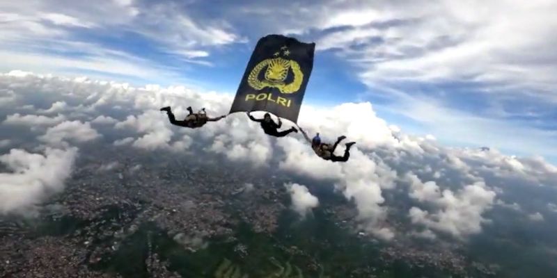 Terlihat tiga orang lebih dahulu keluar, dua di antaranya berseragam Polri. Setelah itu personel lainnya mengikuti. Mereka membentuk beberapa formasi sembari membentangkan lambang Polri serta HUT ke-76 Bhayangkara di udara.